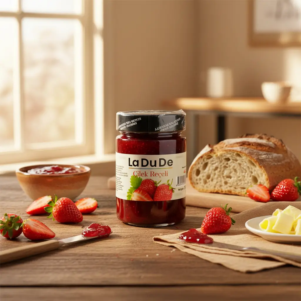 Bahçeden Sofraya Uzanan En Klasik LezzetÖzenle seçilmiş, mevsiminde hasat edilmiş aromatik çilekler; geleneksel reçel yapım yöntemleriyle pişirilerek LA DU DE yorumuyla sofralarınıza ulaşıyor. Meyvenin doğal rengi, kokusu ve dokusu korunarak hazırlanan bu özel reçel; yoğun meyve oranı ve dengeli şeker yapısıyla kahvaltıdan tatlı sunumlara kadar çok yönlü bir lezzet deneyimi sunar.Kıvam dengesiyle öne çıkan LA DU DE Çilek Reçeli; ev yapımı lezzet hissini modern mutfaklara taşıyan gurme bir kahvaltılıktır.Ürün ve Ambalaj Bilgileri