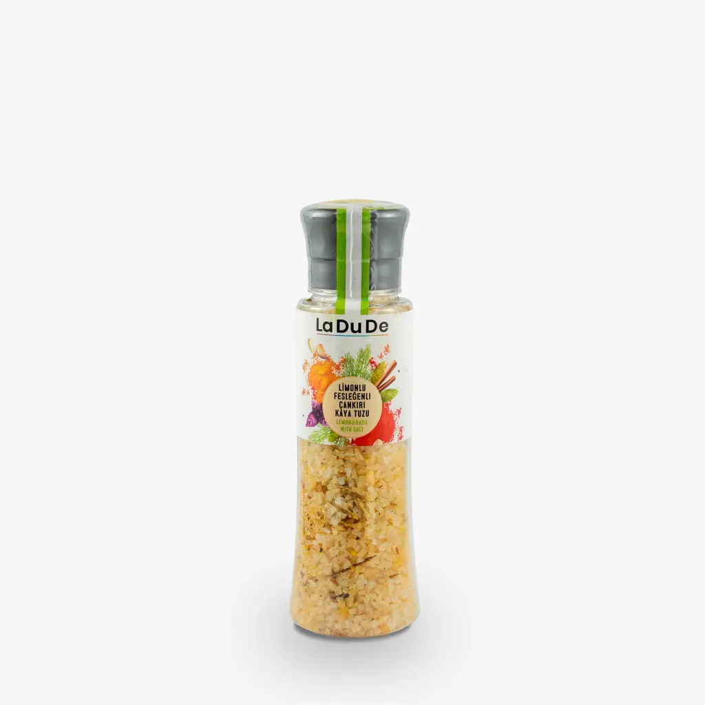 Doğal mineralli Çankırı kaya tuzu; limon kabuğunun narenciye ferahlığı ve fesleğenin aromatik yeşil dokunuşuyla harmanlanarak LA DU DE yorumuyla sofralarınıza ulaşıyor. Yer altı tuz mağaralarından çıkarılan katkısız kaya tuzu; rafine edilmeden, doğal kristal yapısı korunarak hazırlanır.Limonun canlı ve tazeleyici karakteri, fesleğenin hafif baharlı ve otsu aromasıyla dengelenerek yemeklere hem ferahlık hem de rafine bir lezzet katmanı kazandırır. Profesyonel mutfaklardan ev sofralarına kadar geniş kullanım alanına sahip bu özel karışım; özellikle hafif ve aromatik tariflerde fark yaratan gurme bir tuz alternatifidir.Ürün ve Ambalaj Bilgileri